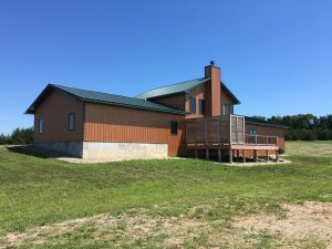 This house features a great room with a 20’ tall ceiling and oak beams with a wood burning fireplace. It also features a concealed fastener steel roof for a sleek modern look.